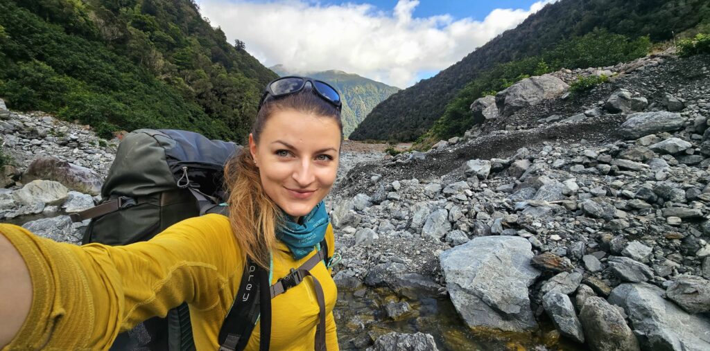 Planistka z wykształcenia, z pasją do map, słów i nieutartych ścieżek. Zaczynała od autostopowych wypraw przez Europę i Azję, by później realizować coraz dłuższe projekty osadzone wśród lokalnych społeczności. Z Syberii trafiła w Andy i do Amazonii. Swój namiot rozbijała także na śniegach norweskich fiordów, pustyni Gobi, Wielkim Murze Chińskim czy wśród sekwoi-gigantów w Kordylierach. W 2024 roku wyruszyła w podróż dookoła świata, podczas której zrealizowała samotne przejście Nowej Zelandii. Jej opowieści to historie zapisane w tysiącach stron notatników – refleksje o tym, co dzieje się w człowieku, gdy znika zasięg, a pozostaje zanurzenie w lokalnych kulturach, kontakt z naturą i uważna obserwacja świata.